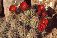 of this Crimson hedgehog are Echinocerens comes from the Greek word for hedgehog, echinos. Early settlers thought the spines of the cactus made it look like a hedgehog. Triglochidialus means "three barbed bristles". The hedgehog cactus has clusters of three spines along its ribs. Each spine can be 2 to 3 inches long. The flowers are a beautiful deep red, with many petals that form the shape of a cup. The fruits are red, and edible. The flowers bloom from April through June, and are the first to bloom in the desert. Unlike other cacti, they stay open at night, and bloom for about 3 to 5 days. This species is the only red-flowered hedgehog. They also have pink or lavender anthers. Not only are the flowers open at night, but so are the plant's pores, or stomata. They use the cool night temperatures to exchange oxygen and carbon dioxide. During the day the plants do their photosynthesis, but they keep their stomata closed so they won't lose any moisture. Some Native Americans collect the flowers stems, burn off the spines and mash them. Sugar is added and then it is baked to make sweet cakes. The plants grow in middle elevations of deserts and mountain deserts. They often grow against rocky outcroppings. They can grow in colder climates because the stems clump so closely together. This reduces surface area through which it can lose heat. It can grow in elevations from 3,020 to 7,915 feet. This plant is native to the American continent. 2001