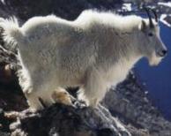 very round Their legs are about 20 inches long. Their hooves are adapted to the rugged slopes by being flexible, like rubber, so they can jump from rock to rock. Their coloring is white and their fur is very fluffy and every strand of hair is about 2 inches long. The Mountain Goat has eight teeth in front so it can easily grab big patches of grass. The Mountain Goat breeds yearly between November and January. Gestation periods last at least 150 to 180 days and the babies are usually born in the spring. This is a beneficial time for the goat's babies, or kids, to be born because it is easier to survive in the warmer weather. Also, there is more food in the summer which the mother can make milk from. When she is ready to give birth, the mother hides in the cliffs in her home territory so that she is safe from predators. The kids are very independent a couple weeks of after birth. The babies stop getting milk from their mother after 3 to 4 months and they stay with her until she reproduces again. Both sexes reach sexual maturity after 30 months. The Mountain Goat changes its social groupings seasonally. They live in big groups in the winter, and smaller groups, or alone in the summer. The male goats are dominant during breeding season. However during the non-breeding season, the adult females are dominant. Mountain Goat hierarchies are determined early by the kids' playing behavior. The stronger more dominant kids become the leaders of their group. The Mountain Goats' habitat also changes from season to season. They migrate between lowland winter areas, and high elevation summer ranges. Some adaptations that help a Mountain Goat to survive are its horns, jumping ability, its hooves, and its teeth. Their horns help to defend them from predators. Mountain Goats have a lot of strength in their hind legs that allow them to jump great distances. Their hooves have a slit in the middle to make them more flexible. They have eight teeth on the top and bottom for an easier way to grab big patches of grass. Mountain Goats' diet is basically grass, woody plants, and moss. They get most of their water from their food. Mountain Goats are prey to coyotes, mountain lions, and bobcats, so they have to be careful where they go. Mountain Goats help the environment by their droppings which add nutrients to the quality of the soil. Mountain Goats are very close to being on the endangered species list. Biologists are trying to stop hunters from killing these herds. by Stephen G. 2001