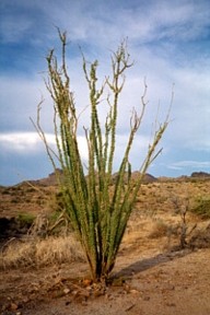 The Ocotillo is pollinates by hummingbirds that like the honey nectar it produces. They feed on the flowers during their travel north from Mexico to the mountains of the Western US. The Ocotillo is very plentiful and not endangered because it's the only Fonquieria to be cultivated. The plant is easily grown from seed and cuttings and sold as nursery stock. The shrub is often use as "fencing" because its spines stop people and animals from passing through. The Ocotillo can be planted at anytime of the year. The Ocotillo is a desert success story. It is a plant that has adapted to its environment, and it is useful to both animals and mankind. by Kaitlin K. 2003