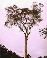 growing alternately along a central rib. They create a bright green, feathery crown. Their seeds are contained within large pods. The trunks have a smooth, silvery bark. The slippery surface discourages sun bears (Helarctos malayanus) from climbing up into the tree to reach the honey combs of the Asian rock bees (Apis dorsata). The bees prefer the tualang because it doesn't branch until almost 100 feet up. Huge buttresses support the tree at its base and keep the giants from toppling over. The sap is irritating to the skin and produces a rash.