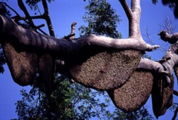 Perhaps the tualang trees are best known for the immense parabolic honey combs which hang from the bottom of their branches. The combs can be 6 feet across and can contain as many as 30,000 bees. One tualang tree can contain more than 100 nests. The world's largest honey bees, Asian rock bees are 1 inch long and the tualangs are their preferred tree species