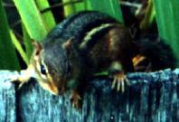 chucking noise when upset. Although people think chipmunks hibernate, they don't go into deep hibernation. They actually move around during warmer weather. They live on the food they have brought into their burrows. Most chipmunks come out of their hibernation in March. Eastern chipmunks will mate twice a year, in the spring and fall. Usually 2 to 5 babies are born. Babies don't open their eyes until they are 30 days old. When they are 2 months old, their mother weans them and they are on their own. A chipmunk can live to be 3 years old. Chipmunks eat mostly what you would expect a squirrel to eat; grains, nuts, berries, seeds, and mushrooms. They also eat bugs and salamanders. They also will raid bird nests, and eat the eggs and baby birds, if they are small enough. They have a special cheek pouch in which they carry their food. Chipmunks are valuable forest creatures because they move seeds around and store them underground. Some of these seeds sprout and become new trees. They are also important as a food source for other mammals, like foxes, coyotes, crows and birds of prey like owls. The chipmunk population rises and falls with the availability of their food sources. When seeds are plentiful, the chipmunk population goes up. This means more food for foxes and other predators, so their populations go up also. Some people think of chipmunks as pests. They eat flower bulbs, fruit and seeds. When there are a lot of them they can cause damage to stone walls, patios, stairs and foundations by burrowing under them. The Eastern chipmunks are native to North America and can be found in the deciduous forests of southeastern Canada and the eastern United States. They are not an endangered species and can adapt to deep forest or suburban living. 2001
