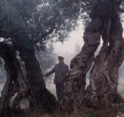 goddess Athena who brought the olive It isn't accurately known what the botanical ancestor of the modern olive tree is, but it is believed to be Oleaster olea sylvestris, which still grows wild in North Africa, Portugal, Southern France, Italy and areas around the Black and Caspian Seas. Some think that it originated from a tree which covered much of the Sahara Desert before the glaciers. Olea europaea needs just the right climate to grow, hot in the summer, a slight winter chill, and plenty of sun. The Mediterranean area and other placeswith Mediterranean climates, such as Texas, Arizona, and California are good places to grow olives. Olive trees can grow in nutrient-poor, but well-drained soils. It needs full sun for fruit production, but also needs a slight winter chill for the fruit to set. Temperatures below 15°F will kill a young tree. In the Mediterranean the olive fruit fly and the Mediterranean fruit fly are it main pests. The olive tree is an evergreen tree with gray-green leaves, and small white fragrant flowers in the spring which produce a lot of pollen. A young olive tree has smooth gray bark, but as it gets older it gets very gnarled. A mature tree can reach a height of 25 to 30 feet, and live for hundreds of years. Some have even lived to be a thousand years. To be able